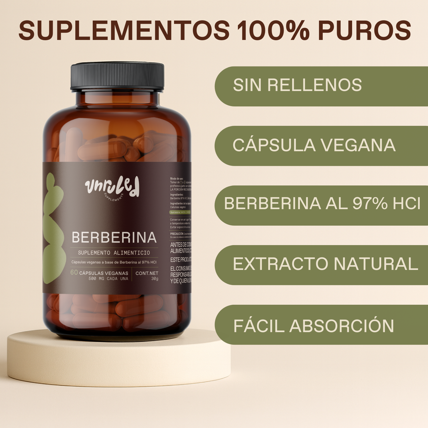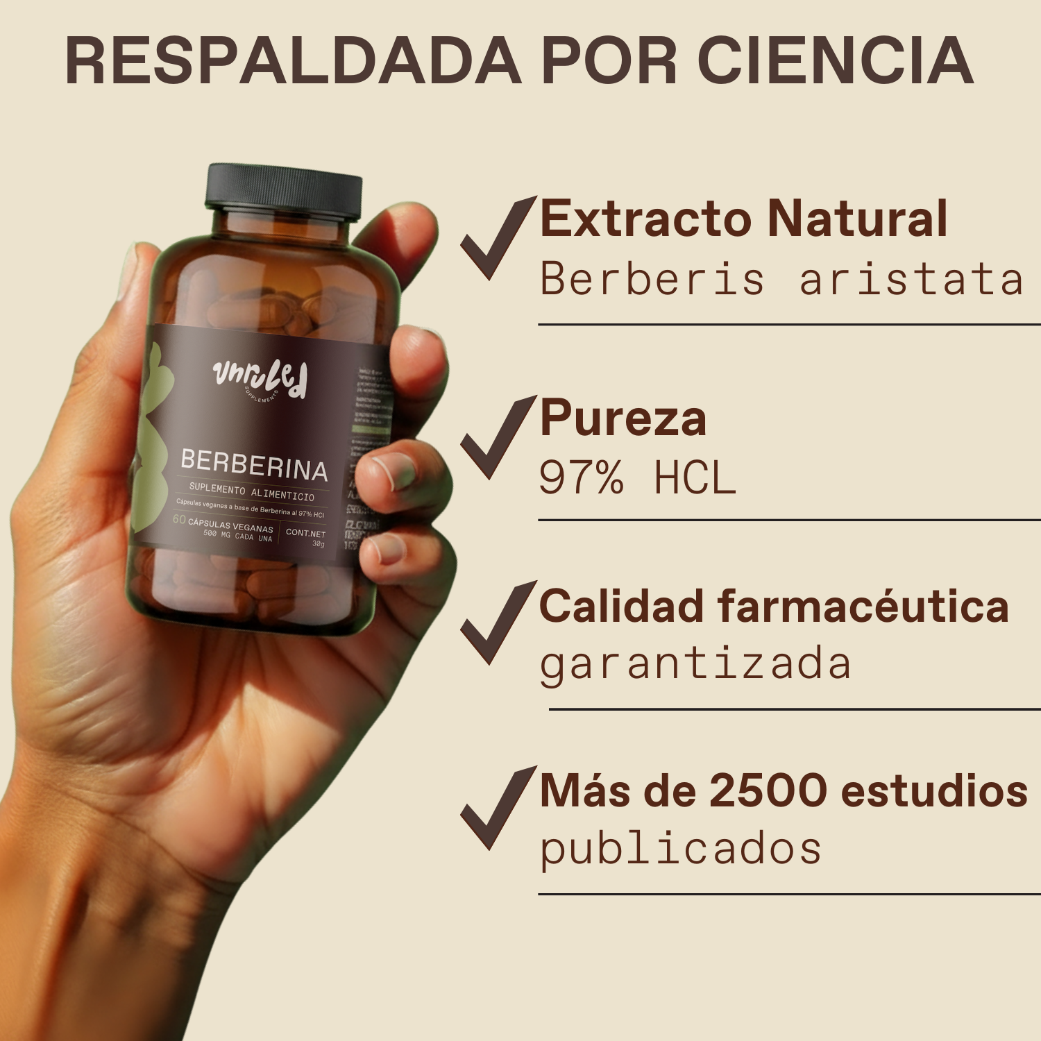 Descubre el poder de la berberina pura en cápsulas, un suplemento diseñado para quienes buscan controlar la glucosa, mejorar el metabolismo y cuidar su corazón de manera natural. Cada cápsula contiene Berberina HCl 97%, sin rellenos ni aditivos, ofreciendo una forma concentrada, limpia y efectiva.